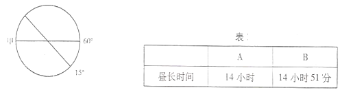 1、单选题 图中直线为经线、圆圈为纬线,该纬线穿过两块大陆的北部,纬线圈中心点处太阳高度为20°,表为当日A、B两地昼长时间,据图完成下列各题。???