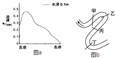 2、单选题 图a为从上游往下游观看的河道剖面流速分布图,它最可能反映图b中河流的哪一处状况(该河流在北半球)( )