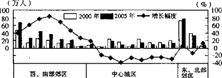 小题1:概述图中所反映的上海外来常住人口在中心城区与郊区的变化情况。