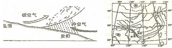 材料一 昆明准静止锋示意圈(左图)???????????????昆明准静止锋位置圈(右图)