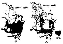 (2)与甲图相比,洞庭湖发生了什么变化?造成这种变化的主要原因是什么?