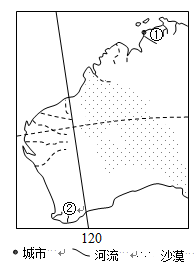 小题2:根据轮廓判断,该区域位于澳大利亚西部,①因气压带风带季节移动和海陆热力性质差异,1月北半球东北信风越过赤道,受南半球地转偏向力左偏影响盛行西北风,河流进入汛期;7月受海陆热力性质差异影响盛行东南风,河流进入枯水期;②位于西南部,为地中海气候,1月少雨,7月多雨,7月河流进入汛期;所以A错,B对。①为热带草原气候,植被为草原,②为亚热带常绿硬叶林,C错;②地沿岸有西澳大利亚寒流影响,①地没有,D错。