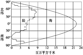2、单选题 读“地球表面海陆面积随纬度分布图”,完成问题。