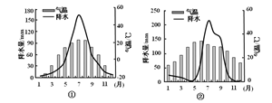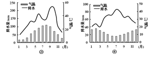 本题解析:试题分析:小题1:根据图示的的气温和降水基本信息判断:①图最低月温在0°C以下,降水量集中于夏季,判断为温带季风气候;②地终年高温,降水量集中于夏季,判断为热带草原气候;③地最低月温在0°C以上,降水量集中于夏季,判断为亚热带季风气候;④地雨热不同期,判断为地中海气候。