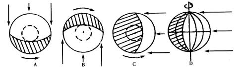 弧线箭头表示地球自转方向)