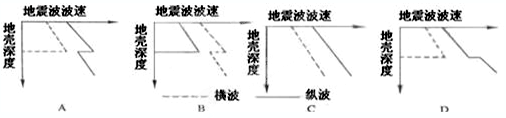 本题解析:试题分析:在不同物质组成的介质里,地震波的传播速度是不同的,其中横波只能通过固体物质,而纵波可通过固、液、气各态物质,且通过液、气物质时,纵波速度降低。因此,根据两种地震波的波速变化可知,A图表示在地壳一定深度,纵波和横波速度降低,且横波不能通过,说明该处上下层物质组成存在较大差异,该深度以下为非固态物质。横波传播速度慢于纵波B传播速度,B图错误。C图反映出该地壳物质组成没有差别。D图反映出纵波传播速度加快,错误。