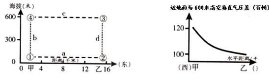 2、单选题 下图示意某沿海地区海陆风形成的热力环流剖面图,图2为该地区近地面与600米高空垂直气压差的分布状况。读图回答下列题。