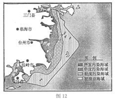 3、单选题 图12为2007年台州市近岸海域水质状况分布示意图。读图回答问题。
