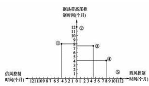 【小题1】根据图示信息,①、受副热带高压和信风控制是热带沙漠气候,②全年受副热带高压控制是热带沙漠气候,③、④受副热带高压和西风带交替控制,均为地中海气候,⑤全年受西风带控制,是温带海洋性气候,所以只有三种气候类型。B对。