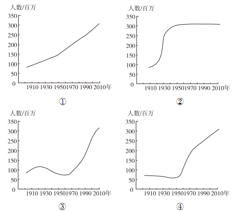 A.1910-1930年 B.1930-1950年 C.1950-1970年 D.1970-1990年 参考答案:小题1:A??? 本题解析:试题分析:小题1:读图,从1910年到1970年,迁移人口变化不大,但迁移人口所占的比重却持续稳定下降,说明这段期间该国人口总数持续稳定增长。1970年后迁移人口增长快,占总人口比重增长较慢,说明人口总数继续增长,只能是①符合,所以A对。②图中1950年后,如果人口总数不变,迁移人口增加,迁移人口占总人口的比例会呈正比例增长,B错。③、④图中总人口出现下降时期,与迁移人口比重下降不相符,C、D错。 本题难度:一般 4、单选题 下图为“中国、美国(本土)两国不同时期的国内人口迁移示意图”,分析完成1~2题。 参考答案:1.C 本题解析: 本题难度:简单 5、单选题 下图为某地人口迁移与年龄关系示意图,读图回答1-2题。 参考答案:1、C 本题解析: 本题难度:一般 |