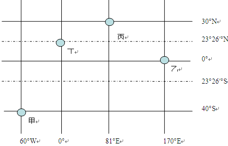 1.图示甲、乙、丙、丁四地线速度由大到小的排序是。2.下列有关甲、乙、丙、丁四地方位的说法中不正确的是。
