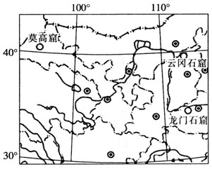 4、综合题 石窟艺术在我国已有数千年的历史。人们在山崖上开凿洞穴,并进行绘画和雕塑,以表达膜拜或宗教虔诚。下图为三大石窟分布示意图。读图,回答下列问题。