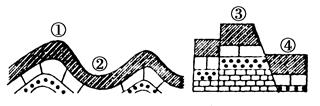 小题2:背斜储油,向斜储水。图示①处中间岩层向下凹,为向斜;②处中间岩层向上拱起,为背斜;③处为地垒;④处为地堑。