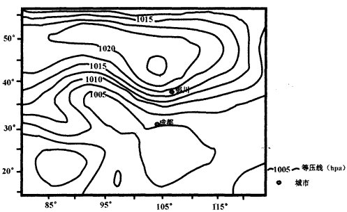 亚洲冷高压一般形成于9月份,并逐步影响我国大部分地区冬半年的天气。受其影响,2006年9月3日至5日,四川盆地经历一次暴雨过程。下图表示2006年9月3日20时地面气压场。