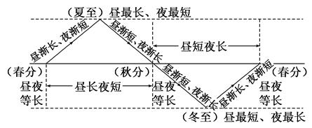 (2)太阳直射点向北移动,北半球昼变长、夜变短;南半球昼变短、夜变长。太阳直射点向南移动时,则情况相反。