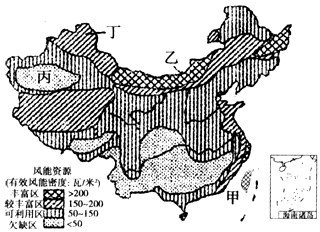 5、单选题 风力发电前景广阔,但风力发电场占地较多。下图是“我国风能资源分布示意图”,读图完成1~2题。