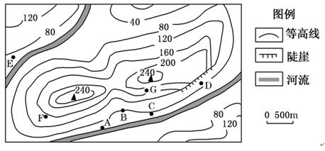 (3) 从保护环境出发,该地实施退耕还林工程是为了保持水土,涵养水源,从等高线来看,G地等高线更密,坡度更陡,且海拔较高,更容易产生水土流失,所以优先退耕还林的是G 处。