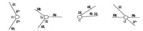本题解析:本题考查我国的主要交通线分布。A项京沪线与沪杭线交汇于上海;错误;B项陇海线与宝成线交汇于宝鸡;错误;C项成昆线与贵昆线交汇于昆明;错误;D项京沪线与陇海线交汇于徐州;正确。