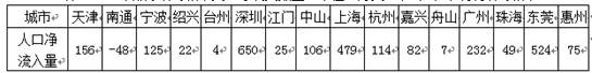 4、单选题  读“2007年部分沿海城市人口净流人数量(单位:万人)表”,表中说明沿海城市