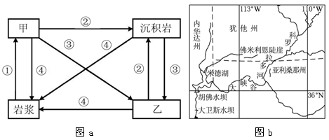 材料 科罗拉多大峡谷是陆地上最长的峡谷之一。从谷底向上,沿岩壁出露着早古生代到新生代的各期岩系,并含有代表性生物化石,大峡谷因此有“活的地质史教科书”之称。图a为地壳物质循环示意图,图b为科罗拉多大峡谷简图。