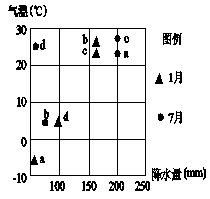 【小题1】1、7月可代表冬夏季,进而判断该地气候特征。读图a地1月气温低于0℃,降水少,7月高温多雨,为温带季风气候。b地1月高温多雨,7月温和少雨,为南半球亚热带季风性湿润气候。c地具有终年高温多雨的特征,为热带雨林气候。d地1月温和少雨,7月高温多雨,为亚热带季风气候。B正确。