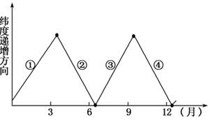 A.AB线 B.CD线 C.EF线 D.AF线 2、单选题 我校(118°E)地理兴趣小组在平地上用立竿测影的方法,逐日测算正午太阳高度。如图所示,垂直竖立一根2米长的竿OP,正午时测得竿影长OP′,通过tga=OP/OP′算出正午太阳高度α。据此回答:该小组每天量测影长时,北京时间应为( ) 3、单选题 地球上,晨线和昏线相接时有两个分界点,位于北半球的分界点设为M,位于南半球的分界点设为N。下图中的折线表示M一年内的纬度变化。读图,回答题。 |
