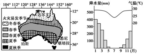 A.偏东风 B.偏南风 C.东北风 D.西北风 4、单选题 下图中左图表示澳大利亚不同地区最容易发生火灾的季节,右图是达尔文市的气候统计图。读图回答小题。 |