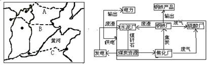 4、综合题 山西省是我国重要的能源基地。下两图分别是“晋煤外运图”和山西省某地遵循“循环经济”理念设计的一个工业“生态链”。读图回答下列问题。