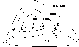 3、单选题 读北半球某地某时海平面等压线图,完成下面两题。1.甲、乙、丙、丁四地中风力最大的是:2.关于图中乙地叙述,正确的是: