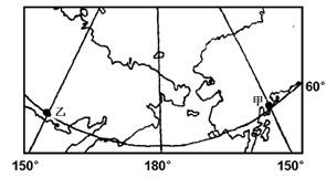 3、单选题 读某区域图,某日一架飞机日出时从乙地起飞,朝正东沿纬线飞行,一路阳光普照,经过4小时到达甲地时,正好看到日落。回答题。