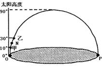 3、单选题 下图中,弧线ONP为某经线圈中的一段,其中N为北极点,阴影为晨昏圈平面,甲乙两点纬度值相同。据此回答题。