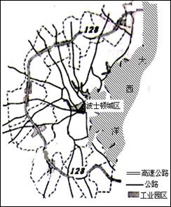 A.延长电厂产业链,提高其产品附加值 B.扩大市场规模,提高产品竞争力 C.吸纳劳动力就业,提高城市化水平 D.提高资源利用率,减少废弃物排放 3、单选题 19世纪中叶,波士顿的制造业在重要性上超过了国际贸易,成为美国最大的制造业重心之一,其中特别以服装、皮革制品和机械工业著称。20世纪早期波士顿工业开始衰落,20世纪70年代波士顿的经济又恢复了繁荣。21世纪初,波士顿已经成为一个科技与文化中心。据此并读波士顿主要交通线路和部分工业园分布图(下图),回答下列问题。 |
