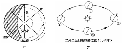 (2)图甲所示为北半球???????(节气日),日期为??????????。此时,地球位于图乙中的???????位置附近。(3分)