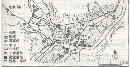 2.丁区域依山傍水,交通便利且方便工人就近住宿,为商业用地的扩大留有余地。甲处靠近飞机场,噪声污染重,乙地区住宅已较集中,丙区距工业用地近,故D项正确。