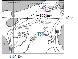 1.由图中的经纬度信息可以判断该处是中国南海,海南岛属于大陆岛,其余众多岛屿多属于珊瑚岛。大陆架指从海岸起在海水下向外延伸的一个地势平缓的海底地区的海床及底土,在大陆架范围内海水深度一般不超出200米。从图中等深线可以判断大陆架面积比较小,海底地形可以结合下图理解记忆。甲处右侧是陆地,左侧有-4000m等深线,可知地势起伏很大。结合教材六大板块示意图可知,该处位于亚欧板块内部。