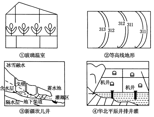 小题1:图①玻璃温室主要是对农业生产条件中的温度进行改造;从等高线数值能看出图②中显示的是梯田景观,主要是在山地丘陵地带,属于对地形的改造;③新疆坎儿井主要是把地表水变为地下水,以减少干旱区的水汽蒸发,属于对水源的改造;华北平原土地盐碱化严重,实施井排井灌是为了改良土壤。