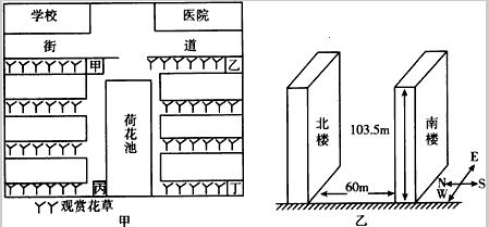 图甲是我国某小区平面,图乙是小区相邻两栋住宅楼分布示意图。