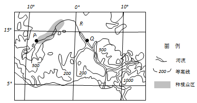 小题1:读图,根据经纬度判断,图示区位于赤道附近,非洲几内亚湾沿岸,位于热带。图中等高线数值表明,本区的海拔并不高,不会有高山永久冰雪融水补给河水,A错。这里的纬度低,是热带地区,没有结冰现象,不可能有凌汛,B错。从P点到Q点河段流经草原、荒漠区,降水少,沿岸种植业发展用水量大,所以河流水量逐渐减少,C对。根据图中等高线数值变化,Q点到河口河水很少穿越等高线,基本沿200米等高线流动,落差并不大,水能不会太丰富。D错。