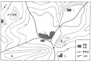(3)某同学在登上当地最高峰朝阳峰时,只看到了图中所示的三个村镇。请说出他不能看到的村镇,并简述原因。(4分)