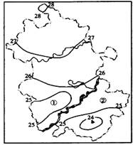 5、单选题 读我国某省区气温年较差(单位:°C)分布图,回答11—13题。