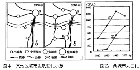 (3)图乙的①②两线中,反映G城人口变化特点的是_______线。