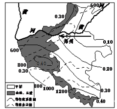 【小题3】图中等径流系数沿箭头方向凸向数值大的地方,说明此处径流系数较两侧低,黄河是地上河集水区域面积小,因此降水量变成地表径流补给黄河的小,径流系数较南北两侧低,D正确。