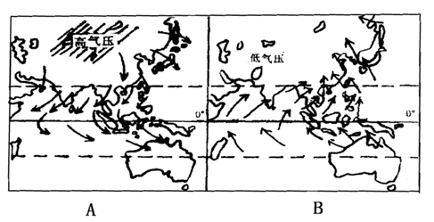 (1)A表示 月, B图中的气压中心的名称是 ,其切断的气压带是 。