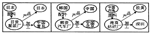 5、单选题 读“我国东部沿海地区三家境外投资建厂的原料地、加工地和产品市场示意图”,回答问题。