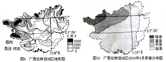 (3)据图10描述广西旱情的空间分布特点:?;请列举两项影响广西旱情分布的自然原因。(8分)