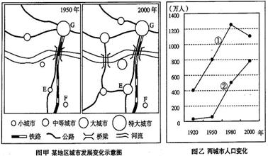 小题1:甲图中1950年至2000年,该地区城市发展变化的特征直接表现________、________。