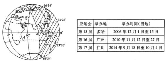 2、综合题 第十六届亚运会于2010年11月12日在广州开幕。图为“广州亚运会开幕时东半球昼夜分布示意图(斜线阴影区为夜半球)”,表为“第15~17届亚运会举办地及举办时间”。读图完成下列各题。(7分)