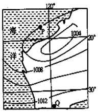 5、综合题 下图为2012年9月14日气压分布图(单位:百帕),读图回答下列问题。(8分)
