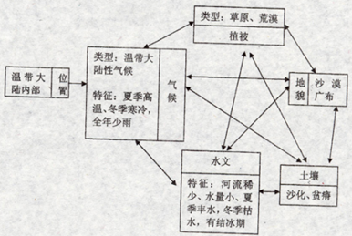 小题1:根据民勤所在地区的自然环境的整体性,填写下面的关系图。