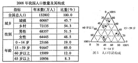 ①城镇? ②农村? ③发达省份? ④欠发达省份 A.①③ B.①④ C.②③ D.②④ 参考答案: 本题解析: 本题难度:一般 2、单选题 读2008年我国人口数量及其构成表,回答8~9题。 参考答案: 本题解析:略 本题难度:一般 3、综合题 阅读下列材料,回答问题:(14分) 参考答案:(1)现代型(1分)?实行计划生育。(1分) 本题解析:本题考查我国的人口问题。(1)目前,我国的人口增长特征为:低出生率、低死亡率、低自然增长率;为现代型模式;我国的人口增长模式的转变主要是由于实施了计划生育政策。(2)我国经济的快速发展反映控制人口增长,提高人口素质利用社会经济的发展。(3)直接读图,老年人口比重大于7%的省区。老龄化反映老年人口的比重高,主要从总人口增长较慢,而老年人口增长快的角度分析。(4)从人口分布密度反映东部地区稠密,西部地区人口稀少;从1990年到2000年的人口密度变化反映东西部的人口密度差距在拉大。主要的原因主要从东西部经济发展的差异导致的人口迁移角度分析。 本题难度:一般 4、单选题 当某一国家或地区60岁以上人口比重超过10%时,进入老龄化社会。进入老龄化社会时人均GDP:中国为3870美元,美国为10645美元。少数民族人口占多数的省级行政区,其中西藏达到93.94%,新疆达到59.43%,汉族人口比例小。据此回答下列各题。 |
